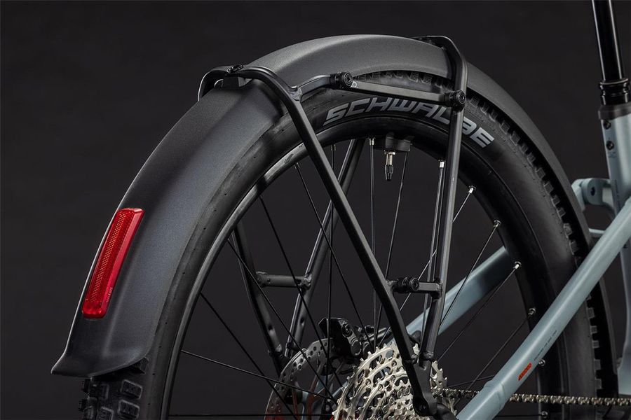 Ein Blick auf die serienmäßig verbauten Schutzbleche, den semi-integrierten Gepäckträger und die Lichtanlage und es ist klar: Beim Stereo Hybrid ONE44 FE handelt es sich um einen absoluten Vielseitigkeitsprofi. Doch das praktische Zubehör erzählt nur einen Teil der Geschichte. Sein Bosch CX Motor mit bis zu 100 Nm Drehmoment wird von einem kompakten 800 Wh PowerTube Akku gespeist. 140 mm Federweg vorne und hinten sorgen für erstklassiges Handling und bärenstarke Performance im Gelände. Außerdem spielt das Internal Cable Routing der cleanen, eleganten Optik des Rahmens in die Karten. Dazu kommen ein UDH Schaltauge für einfache Ersatzteilverfügbarkeit und eine unauffällig und formschön ins Design integrierte Direct Mount Kettenführung. Clever: Dank Size Split hat CUBE für so gut alle die richtige Passform im Angebot.
