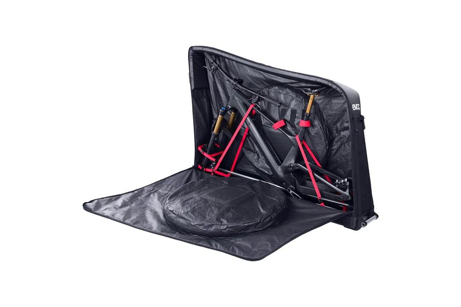Die Evoc Mountain Bike Bag Pro transportiert dein Mountainbike dank optimierter Geometrie nun noch einfacher, ohne das zeitraubende Abbauen von Lenker oder Cockpit.