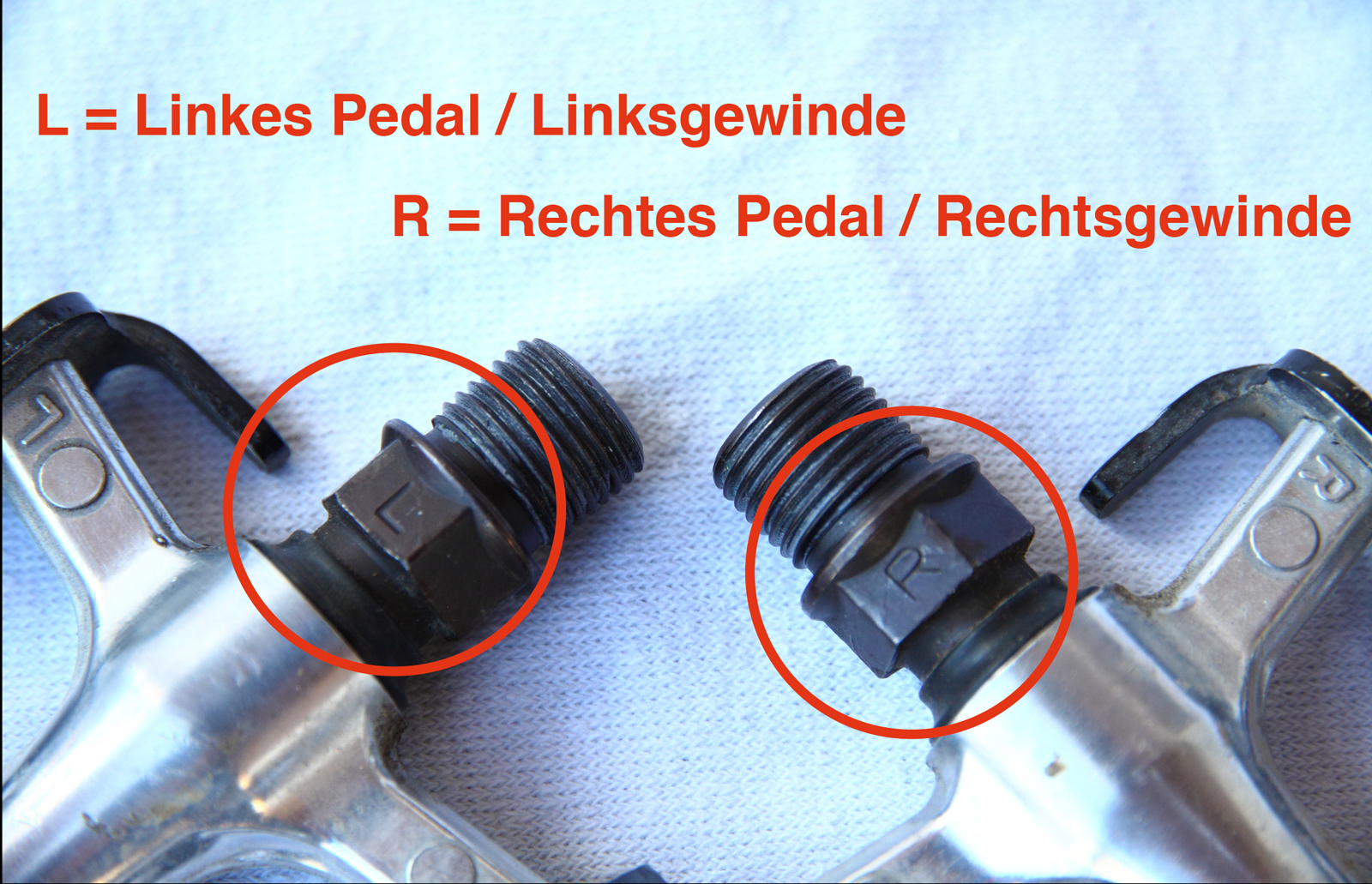 Zur Identifikation der beiden verschiedenen Gewinde sind Pedale in der Regel mit den Buchstaben R und L gekennzeichnet. Entweder am Pedalkörper oder in der Nähe des Gewindes, meist direkt auf dem Sechskant.
