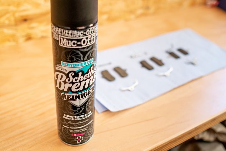 Nachdem du den Bremsbelag angeschliffen hast, solltest du ihn mit Bremsenreiniger ausspülen, um die letzten Verschmutzungen zu beseitigen. Achtung: verwende wirklich nur Bremsenreiniger und kein Aceton oder andere alkoholische Reiniger. Bevor du deine Bremsbeläge wieder einbaust, solltest du unbedingt noch deine Bremsscheibe reinigen.