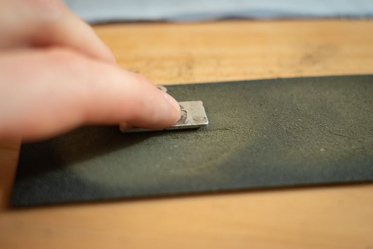Schleife die oberste Schicht des Bremsbelags mit Sandpapier in kreisenden Bewegungen ab. Lege das Sandpapier auf eine flache Oberfläche und kreise den Belag darüber. Sei vorsichtig, dass du nicht zu viel Belag wegnimmst, denn der eigentliche Bremsbelag an Fahrrad Scheibenbremsen ist nur etwa 1,5 mm – 2 mm dick.