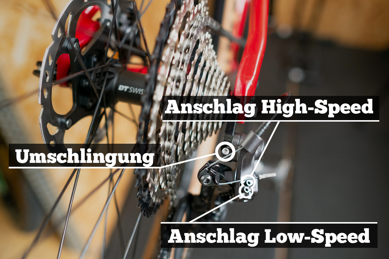 Bei der Einstellung des Low-Speed Anschlags ist wichtig, dass die Kette auf keinen Fall über das größte Ritzel hinaus schalten kann. Schaltest du also alle Gänge bis zum größten Ritzel hinauf, darf sich der Schalthebel auf dem größten Ritzel nicht oder nur noch minimal drücken lassen und das Schaltwerk sollte sich nicht mehr in Richtung Speichen bewegen. Ist der Anschlag zu weit innen eingestellt, schaltet die Kette nicht oder nur schwer auf das größte Ritzel.