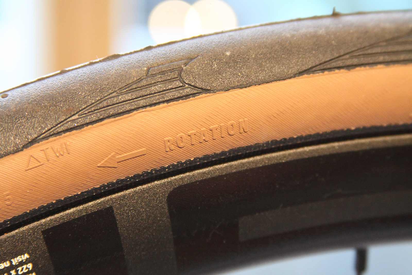 Spätestens bei der ersten Panne wirst du bemerken, dass Rennradreifen in der Regel sehr straff auf der Felge sitzen. Grundvoraussetzung für die Demontage ist es, den Reifen rund herum vom Felgenhorn zu drücken und ganz nach innen in die Mitte des Felgenbetts zu schieben. Durch die Vertiefung erhält der Reifen nun mehr Spielraum, so dass man ihn an einer Stelle über die Felgenflanke heben kann. Ohne Reifenheber (Werkzeug) wird das dennoch kaum gelingen! Deshalb gehört ein Heber-Set neben einem Ersatzschlauch in jedes Satteltäschchen. Achtung bei der Wiedermontage: Auch die meisten Rennradreifen besitzen eine empfohlene Laufrichtung, die an der Seitenflanke angezeigt wird. Außerdem gilt es darauf zu achten, den Schlauch beim Zurückhebeln des Reifens auf die Felge nicht einzuklemmen.