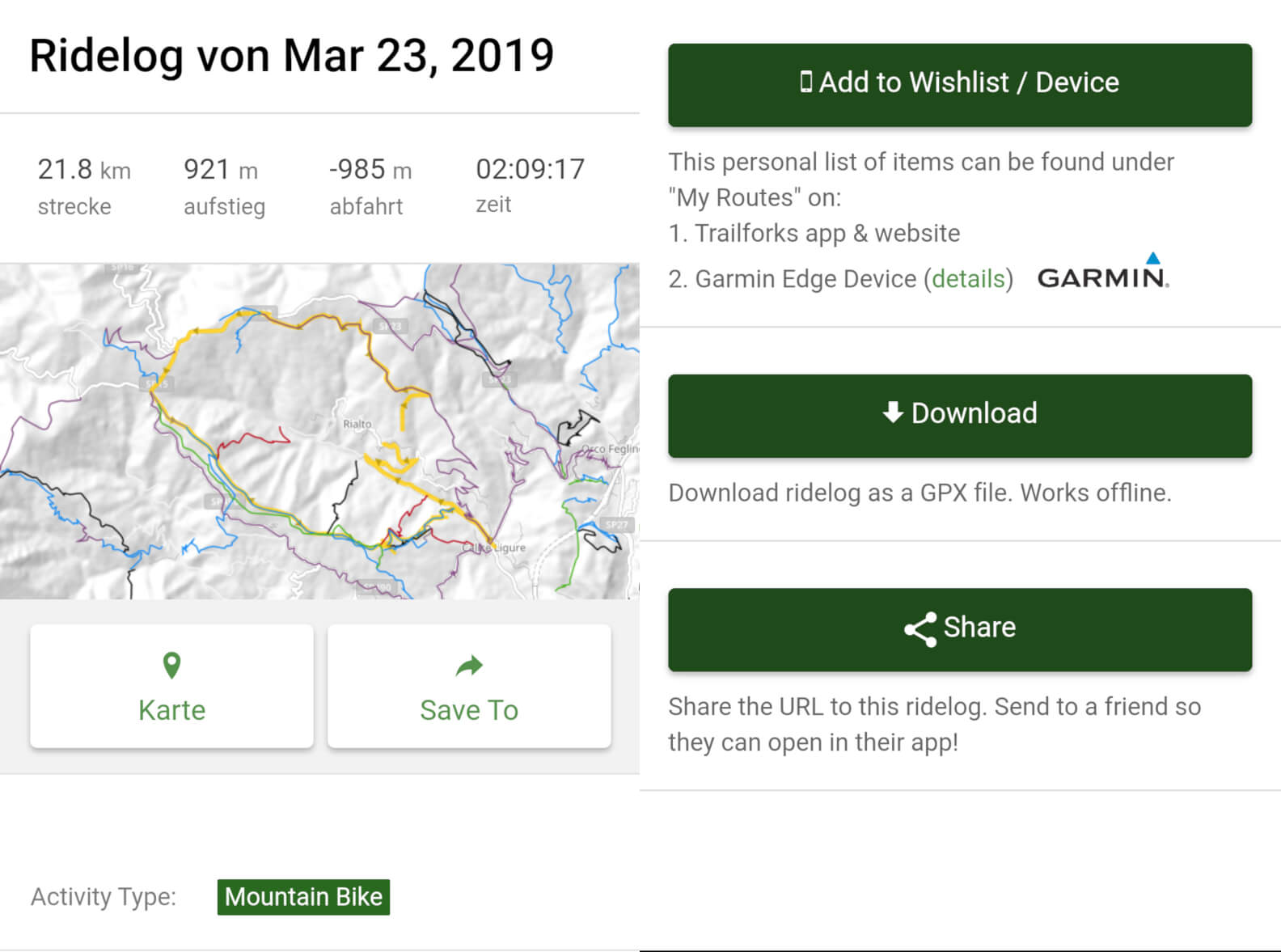Ein sehr nützliches Feature sind die Ridelogs. Wurde ein Trail von anderen Bikern gefahren und als Route getrackt, dann kann man den Ridelog von dieser Fahrt unter dem Trail selbst finden. Die Ridelogs von anderen kannst du wieder als GPX Datei exportieren und beispielsweise auf ein Garmin übertragen. So ist keine Routenplanung notwendig und man hat die komplette Route inklusive Uphill und Trail direkt navigationsbereit auf dem Gerät. Das Konvertieren der Ridelogs funktioniert über die App auf dem Smartphone und ist die simpelste Methode, einen neuen Trail zu erkunden.