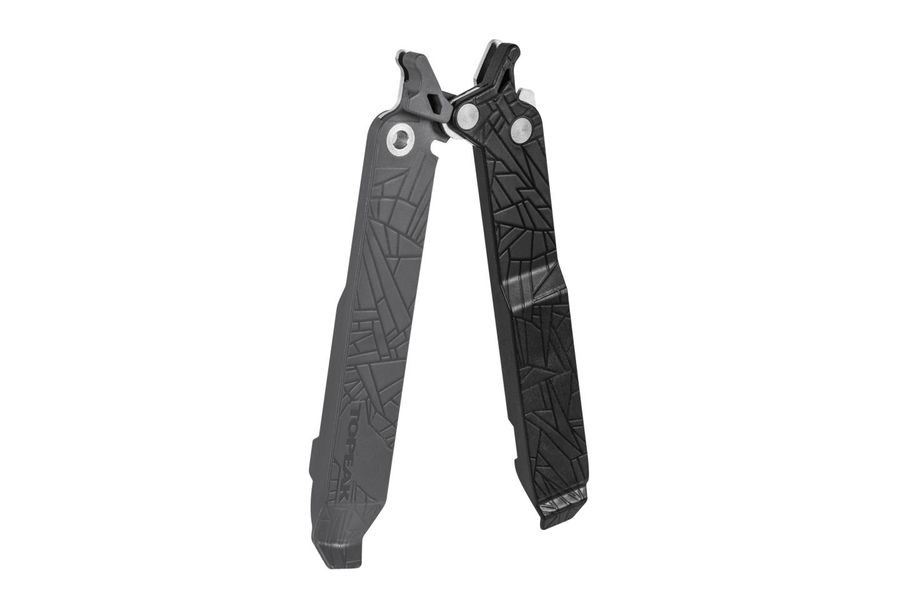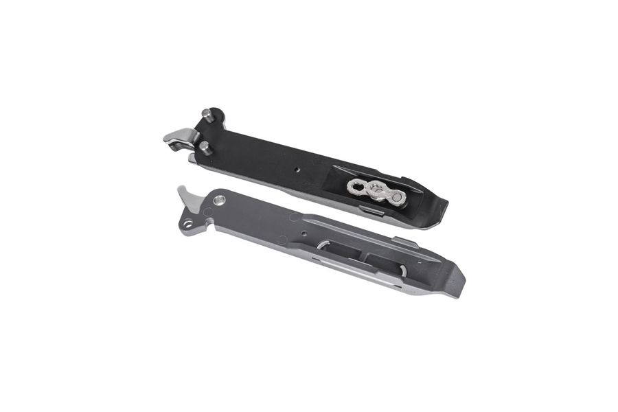 Geniales Kettenschloss-Reifenheber-Werkzeug! Die zwei Reifenheber lassen sich zu einer Hochleistungszange zum Öffnen oder Schließen aller gängigen Kettenschlösser verbinden. Ein integrierter Kettenfixierhaken hält die Kette beim Entfernen oder Einsetzen von Kettenschlössern für bequemes Arbeiten zusammen. Passend dazu lässt sich ein Ersatz-Kettenschloss in einem integrierten Fach transportieren. Im Handumdrehen kann die Zange getrennt, in zwei Reifenheber verwandelt und für schnelle Reifenreparaturen verwendet werden. Als Sahnehäubchen ist noch ein Presta-Ventilwerkzeug zum Entfernen von Presta-Ventileinsätzen integriert.