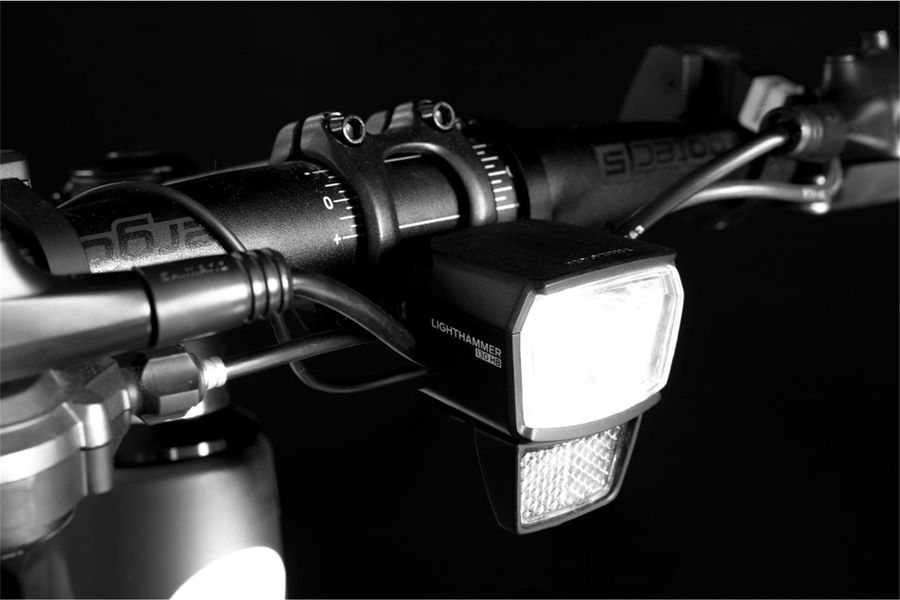 In the Trelock Lighthammer front headlights for e-bikes, Trelock engineers have combined state-of-the-art LED technology with a sophisticated optical system. With its 130 lux, the LS 930-HB generates a wide field of light with additional close-range illumination. With the high beam mode, which can be switched on via the handlebars, the driver moves safely through traffic even in the darkest light conditions. An aluminum housing ensures optimum heat dissipation. The headlight can be mounted on the fork with the supplied bracket and is of course StVZO-approved. Suitable for e-bikes (12V).
