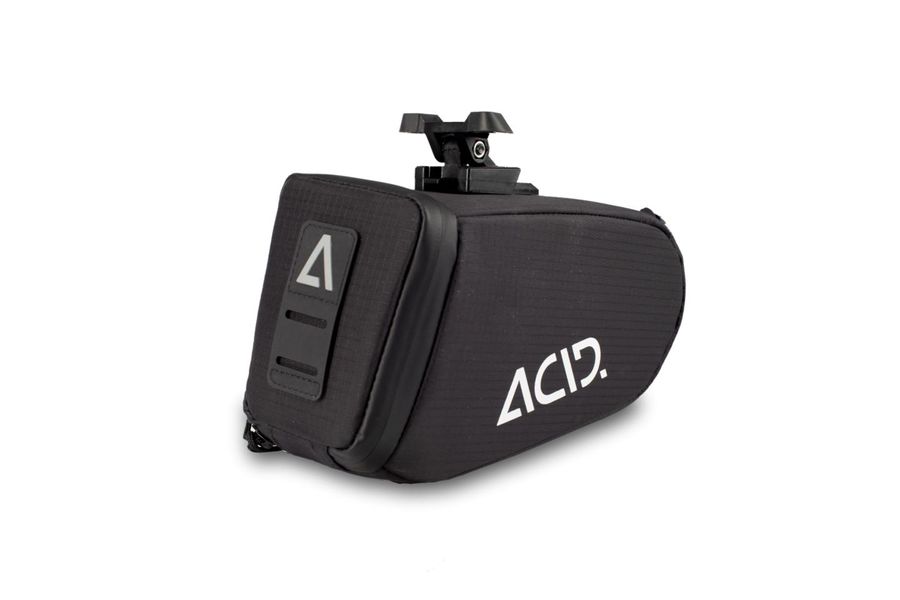 Die ACID PRO L Satteltasche hält deine Habseligkeiten sicher unter dem Sattel verstaut, wo sie nicht im Weg stehen. Das kompakte Design, die wasserdichte Konstruktion und der Rücklichthalter sind typische Details, die eine Satteltasche von ACID besonders machen.