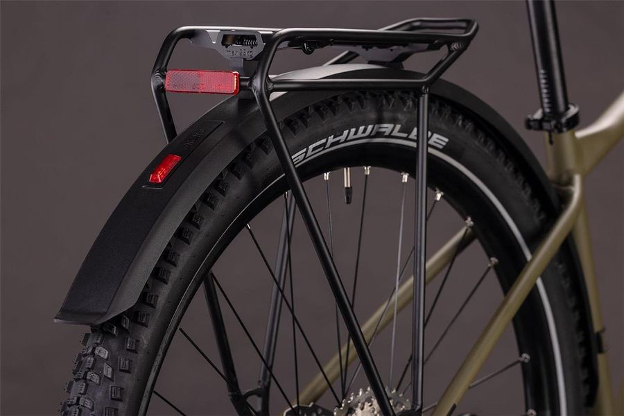 Der Aim FE Rahmen setzt in Sachen Vielseitigkeit neue Maßstäbe: Er kommt mit Schutzblechen, Gepäckträger und Lichtern daher und ist somit direkt startklar für alles, was von ihm verlangt wird. Außerdem hat CUBE ein geschraubtes Tretlager verbaut und die Züge ins Innere verlegt. On top gibt's eine Aufnahme für Flat Mount Scheibenbremsen, die nahtlos in die Seitenständeraufnahme integriert ist. Die spezielle Geometrie hat ein niedrigeres Oberrohr für superzuverlässiges Handling und lässt genug Platz für breite, griffige, komfortable 2.25 Zoll Reifen. Dazu ist das Size Split System breit aufgestellt – so finden alle das für sich und ihre Körpergröße perfekt passende Aim FE.