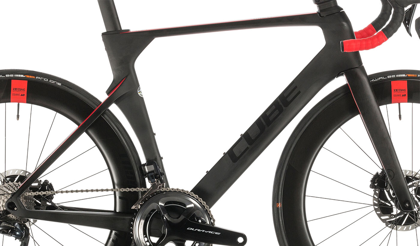 Demzufolge hat CUBE bei der neuen Litening Serie ein konsequentes Aero-Konzept umgesetzt. Als Ausgangspunkt für die Entwicklungen dienten die Rahmen der CUBE Aerium Serie, die bei Triathleten bereits seit Jahren hoch im Kurs stehen. Nicht nur Rahmenrohre und Gabel konnten dank des Werkstoffs Carbon windschlüpfrig geformt werden: Der neue Lenker erinnert gar an einen filigranen Tragflügel. Darüber hinaus bildet er mit dem Vorbau eine stabile Einheit. Weitere Optimierungen: Die Züge verlaufen von den Hebeln weg sowohl durch den Lenker als auch durch den Vorbau in den Rahmen hinein. Und zu guter Letzt schneidet die Sattelstütze schmal wie ein Schwert durch die Luft. Ergebnis: Laut den Messungen im Windkanal konnte man mit den neuen Aero-Maßnahmen 30 Watt an Luftwiderstand einsparen.