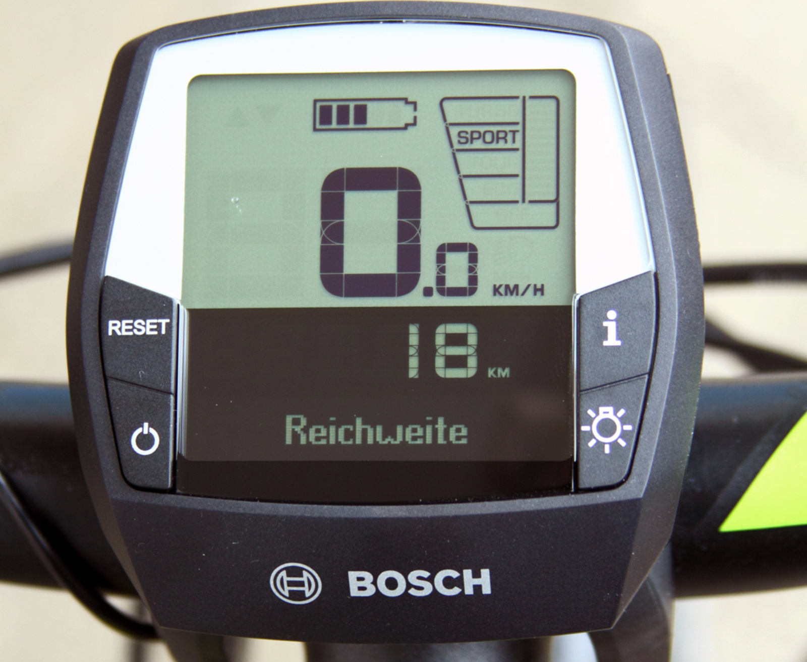 Das Display bietet auch die Möglichkeit, die Reichweite des Akkus zu überwachen. Man kann direkt beim Umschalten der Modi sehen, wie sich die verbleibende Distanz erhöht oder verringert. Klar, im Turbo-Modus macht es einen riesen Spaß, die Steigungen hinauf zu preschen. Ein Blick aufs Display mahnt jedoch zur Zurückhaltung! Denn der Turbo saugt den Akku leer wie ein durstiges Kamel an der Oase. Die Reichweite sinkt bei vollem Akku schlagartig auf 30 Kilometer und sogar deutlich darunter.