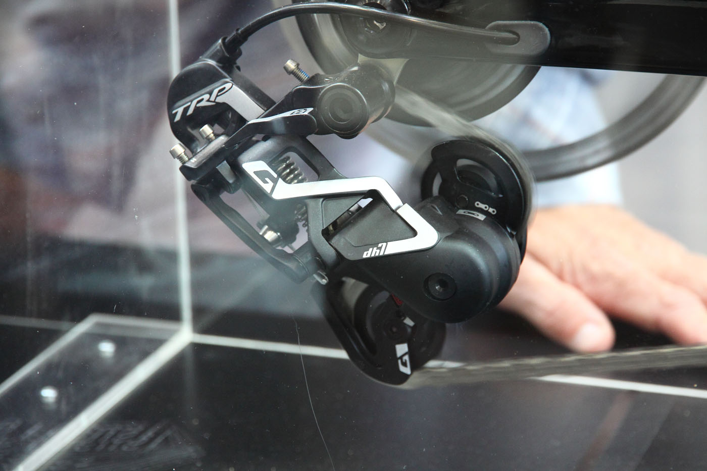 Der Hingucker auf dem Stand war aber zweifelsohne das neue TRP Schaltwerk, welches ebenfalls speziell für den Downhill-Einsatz konzipiert wurde. Es besitzt am Käfig eine besondere Reibungskupplung, die für konstante Kettenspannung sorgt und das Schlagen der Kette verhindert. Außerdem ist das Schaltwerk am Schaltauge arretierbar, was für noch mehr Ruhe im Antrieb sorgt. Der Schalthebel kommt ebenfalls aus dem Hause TRP. Für die restlichen Teile des Antriebs muss man jedoch (noch) auf andere Komponentenhersteller zurückgreifen.