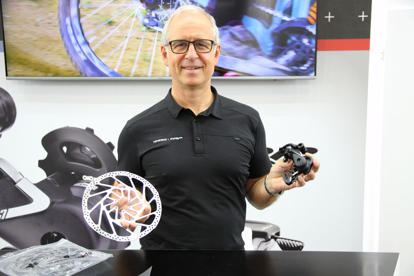 Der taiwanesische Hersteller Tektro ist seit Jahren bekannt für Scheibenbremsen im Einsteigerbereich. Nach einiger Zeit kam die Marke TRP hinzu, mit der Tektro auch im oberen Preissegment Fuß fasste. Dazu Marketing-Mann Dirk Belling auf der Eurobike: „Wir sehen besonders im E-Bike Bereich ein großes Potenzial.“ So waren beispielsweise neue, verstärkte Bremsscheiben am Stand zu sehen – vor allem im Downhillsport haben sich TRP Scheibenbremsen inzwischen einen Namen gemacht.