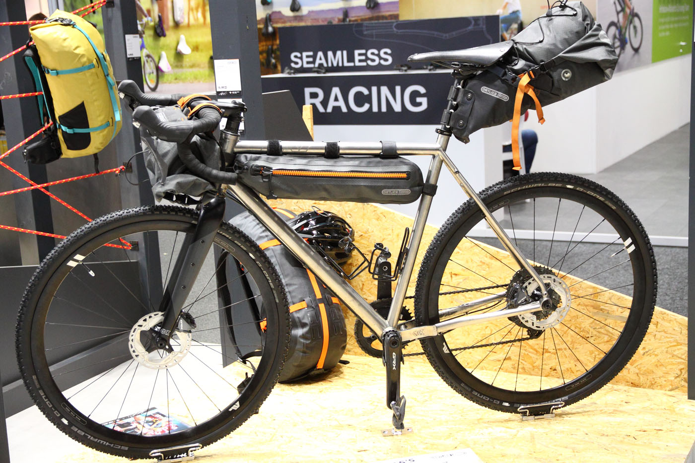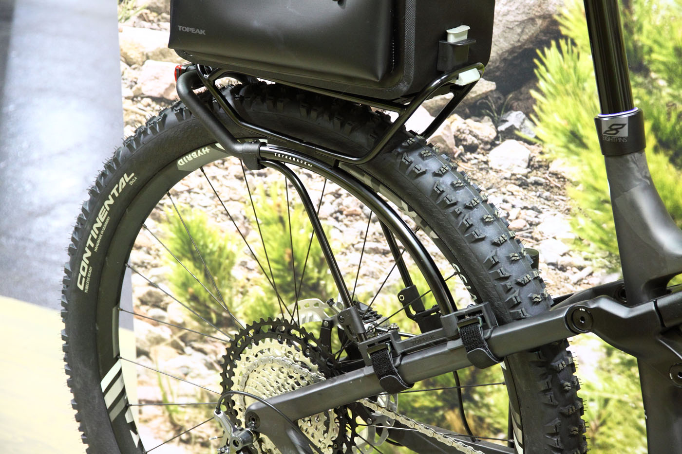 Neben einem riesigen Programm an Packtaschen und Zubehörparts aller Art präsentierte Importeur RTI ein neues Gepäckträger-System, das man auch an Rahmen ohne entsprechende Gewindeösen montieren kann. Der Tetra Rack lässt sich mit Hilfe eines Quick-Mount-Systems an den Sitzstreben oder an der Gabel befestigen. Egal, ob Fully, Hardtail oder Starrbike. Es gibt die Varianten M (1+2 für MTB) und R (1+2 für Trekking/Road/Gravel). Belastbarkeit M: 12 Kilo hinten, 10 Kilo vorne. R: 9 Kilo, 7 Kilo vorne.