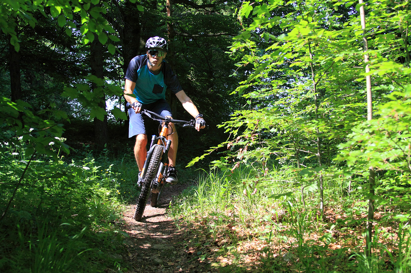 Bevor es los geht darf man nicht vergessen, die blauen Hebel an Gabel und Dämpfer in die Stellung „Open“ zu bringen. Damit spricht das Fahrwerk sensibel an und es steht der volle Federweg zur Verfügung. Man spürt sofort: Bergab ist das Trance E+ in seinem Element. Dank des tiefen Schwerpunktes liegt das Fahrwerk unglaublich satt auf dem Trail. Bockige Wurzelpassagen werden einfach glatt gebügelt. Einmal mehr spielen die fetten Reifen ihren Komfort-Bonus aus. Der breite Lenker lässt dich stets die volle Kontrolle über die gewählte Fahrlinie behalten. Und wenns knifflig wird kannst du mit einem Hebeldruck die Sattelstütze versenken. Die Bremsen beißen energisch zu, es kommt nie Zweifel daran auf, rechtzeitig zum Stehen zu kommen. Einziger Kritikpunkt auf steilen Bergab-Passagen bleibt die etwas niedrige Front, geschuldet dem kurzen Steuerrohr des Rahmens.