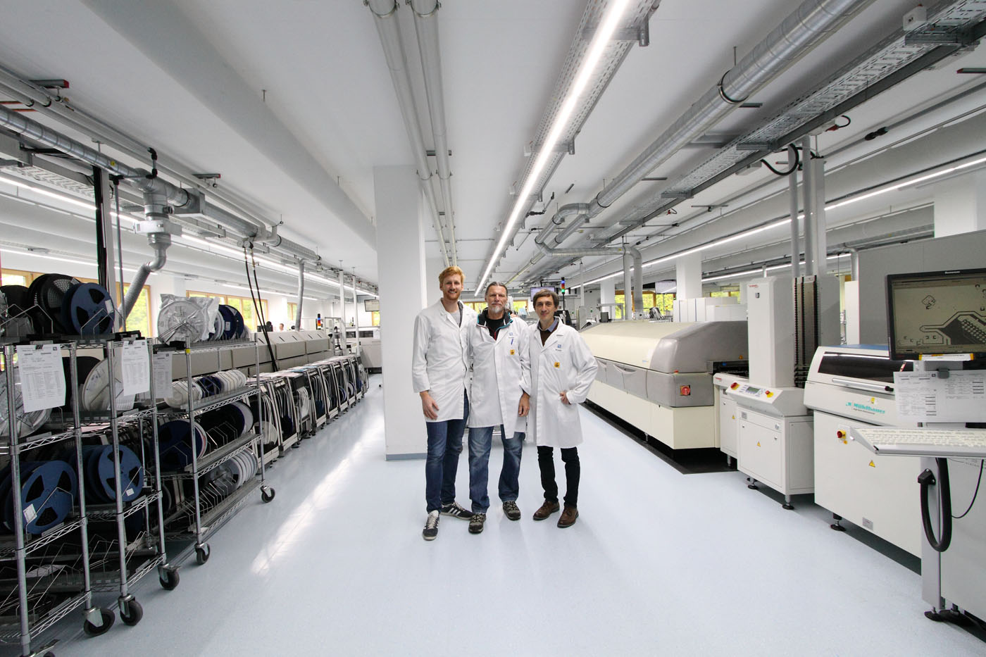 Sofort umfängt uns das Summen der Fertigungsstraßen, wo Platinen im Sekundentakt bestückt werden. Es riecht nach Lötzinn und Kunststoff. Tausende winzig kleiner Bauteile auf Kunststoffbändern laufen von rotierenden Spulen in die Maschinen hinein. Wie an einem Aquarium gewähren Sichtscheiben einen Blick auf den Prozess. Tackernde Nadeln setzen die Lötpunkte so schnell, dass das menschliche Auge kaum folgen kann. „Man sollte gar nicht vermuten, wieviel Elektronik sich im Antrieb eines E-Bikes versteckt“, sagt Kevin Fencil. Zum Beispiel müssen die Daten der Sensoren ständig ausgewertet werden, um die Motorleistung dem Antrieb harmonisch zuzuführen.