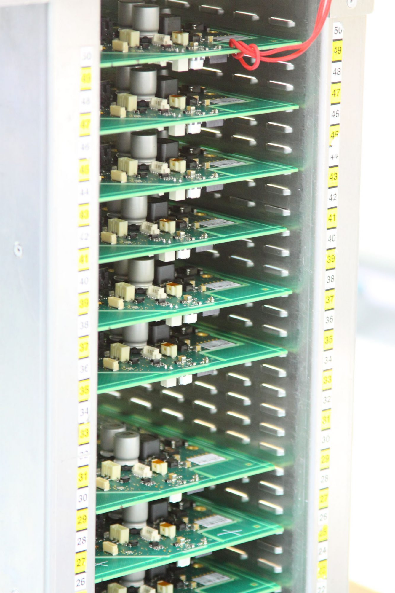 Aber nicht alles läuft bei der Fertigung vollautomatisch. ArbeiterInnen schauen durch Mikroskope und checken verschiedene Platinen stichprobenartig. An anderen Plätzen werden Schaltungen am Bildschirm kontrolliert. Bis zum Einbau in den Motor durchläuft eine Platine etliche Qualitätskontrollen. „Höchster Qualitätsstandard ist das oberste Gebot bei TQ-Systems“, sagt Simon Hoffmann. „Das Zertifikat zur Herstellung von Bauteilen für die Luft- und Raumfahrt erhält schließlich nicht jeder.“