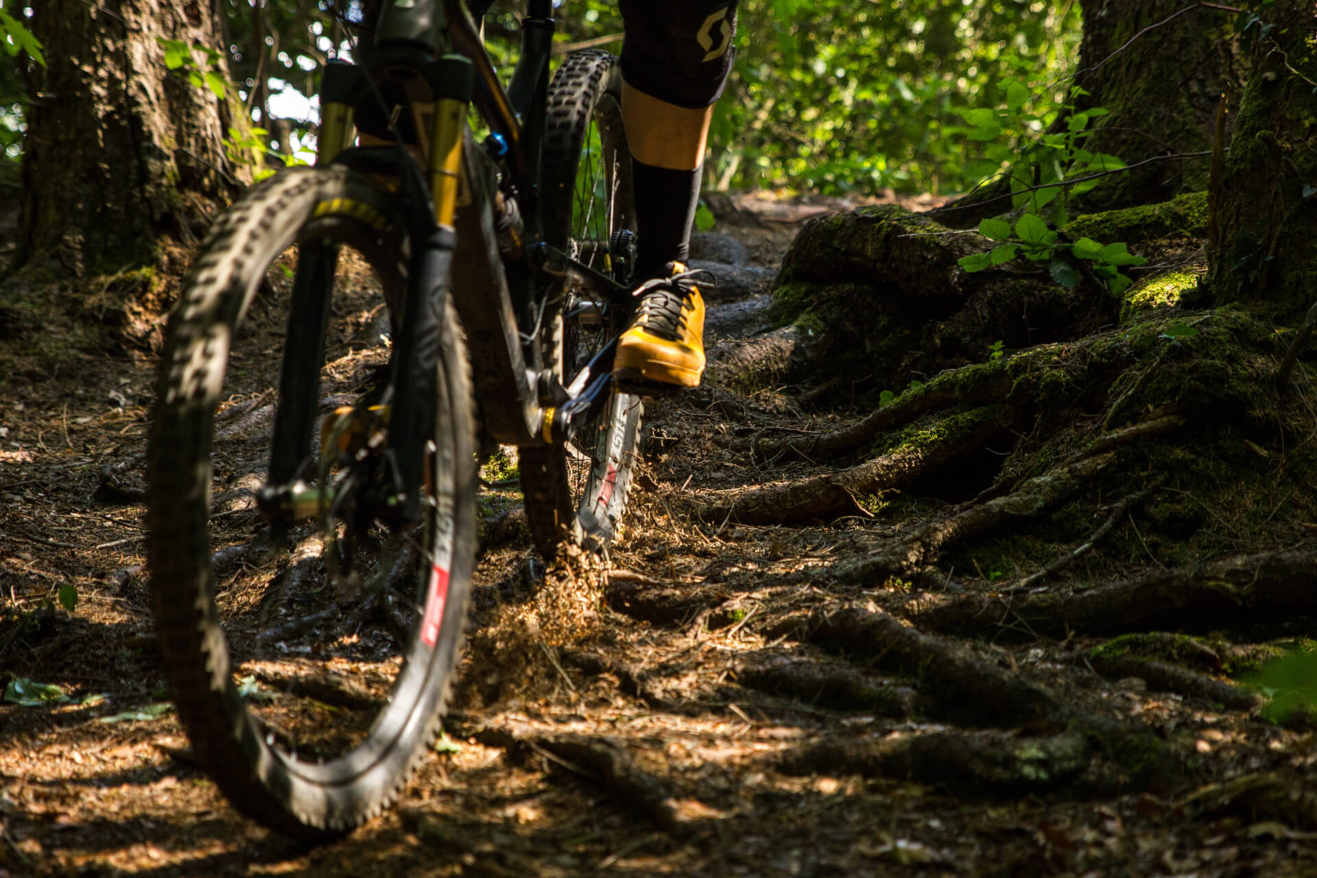 Mit der Gummimischung hast du den größten Einfluss auf die Traktion eines Reifens über Wurzeln und Steine, vor allem wenn diese nass sind. Eine sehr weiche Mischung lässt die Stollen des Reifens besser auf den rutschigen Oberflächen eines Trails kleben und erhöht so den Grip, allerdings sorgt das auch für mehr Rollwiderstand. Eine harte Gummimischung ist resistenter gegen Abnutzung und Verschleiß.