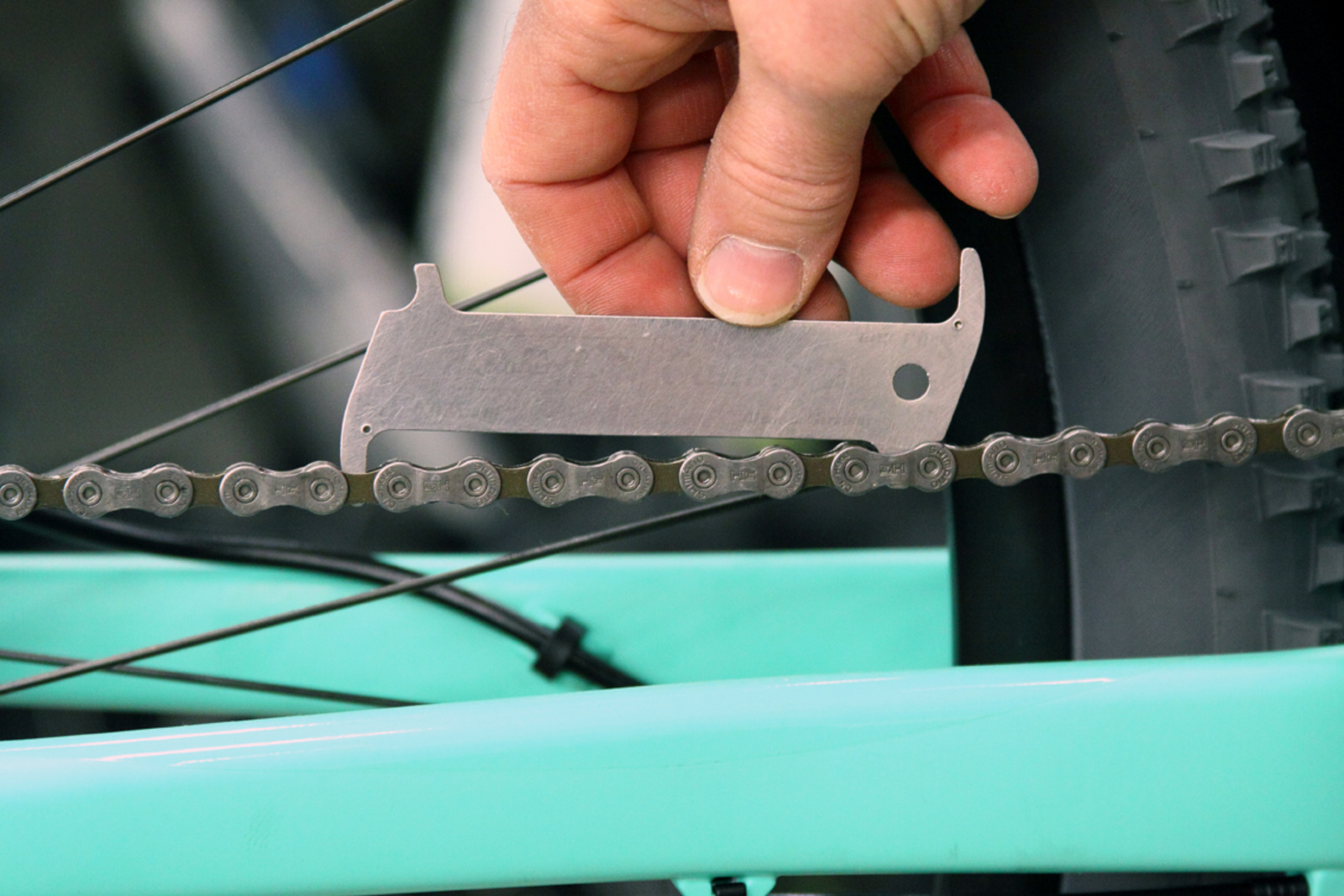 Läuft die Kette nach der Winterpause noch geschmeidig? Das siehst du beim langsamen Rückwärtskurbeln. Achte besonders auf die kleinen Röllchen im Schaltkäfig. An deren engen Radien fällt ein schwergängiges Kettenglied sofort auf. Wenn Ölen alleine nicht hilft, dann versuche, die Stelle durch seitliches verbiegen/dehnen der Kette wieder gängig zu machen. Kettenlängung prüfen: Am besten klappt das mit einer speziellen Messlehre/Schablone, die du im Fachhandel kaufen kannst. Warum die Längung prüfen? Weil ein rechtzeitiger Tausch der Kette hilft, den Verschleiß von Kettenblättern und Ritzeln hinaus zu zögern. Und eine neue Kette zwischendurch ist keine große Investition. Zum Abschluss noch alle Gänge durchschalten und gegebenenfalls die Schaltung einstellen.