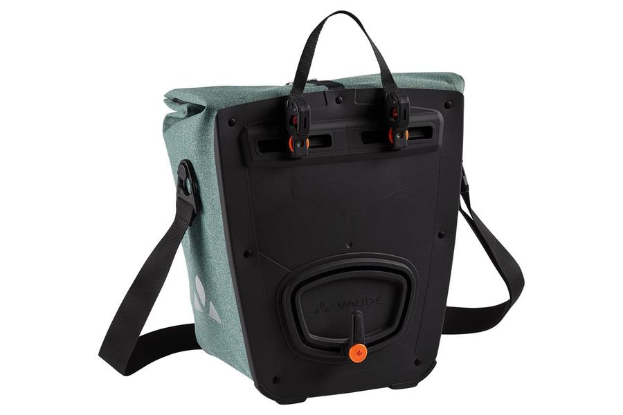 Der Hartschalen-Taschenrücken "Hard Back 2.0" besteht aus stabilem Kunststoff. So ist deine VAUDE-Radtasche extrem stoß- und abriebfest. Die stark beanspruchten Kanten sind mit rutschfesten Standfüßen ausgestattet. Den unteren Führungshaken kannst du frei um 360 Grad drehen. So lässt sich deine Radtasche ganz flexibel an jeden Gepäckträger anpassen. Die maximale Beladung beträgt 12,5 kg pro Tasche.