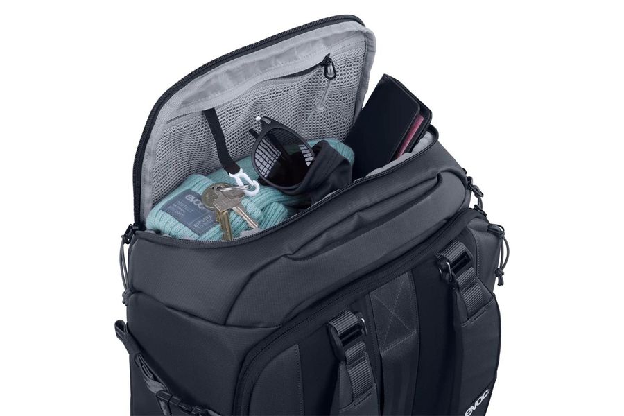 Versatile with practical features – the Evoc Athlete 30 is a carry-on sized rucksack that performs well on every trip. With a 30-litre capacity and optimally integrated compartments, it offers ample storage space for all your essential travel items. Thanks to a unique top compartment, important items such as headphones, your passport or a sleep mask are always within easy reach. Technical devices such as a laptop are also immediately and easily accessible via the quick-access side opening to the main compartment. Removable shoulder straps and a side carry handle allow you to transform the rucksack into a compact suitcase in no time at all. The highlight: the back panel can be opened fully, allowing the Evoc Athlete 30 rucksack to be loaded like a suitcase. Made from robust and abrasion-resistant fabric, it will be a reliable and durable companion for your upcoming adventures.