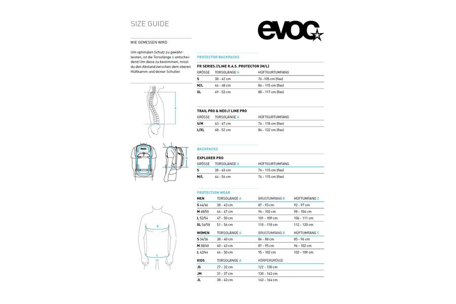 High-end performance with minimal weight: The protector backpack with next-level protection function ensures top performance and maximum wearing comfort with its sporty, compact fit and uncompromising support. Ideal for day tours or extended trail riding. In keeping with its DNA as the leading brand for protector backpacks, EVOC has created a whole new level of protection with the highest possible wearing comfort and fused it into a revolutionary, ultra-light protector backpack. The back protector is removable if required and can be replaced after damage from a fall in EVOC's Free Protector Crash Replacement programme. In addition to its special protective function, the Trail Pro 16 also offers other features: Among other things, this backpack has a practical compartment for your hydration bladder (extra accessory) and a matching opening for the drinking tube on the top of the backpack. On the left and right of the hip belt, there is space for small accessories such as a multitool or your house key. There is a tool pocket on the back of the backpack. Despite its protector, this backpack weighs only 1070g (S/M) or 1170g (L/XL) depending on the size, making it one of the lightest backpacks on the market. You can find the right size by measuring your back length.