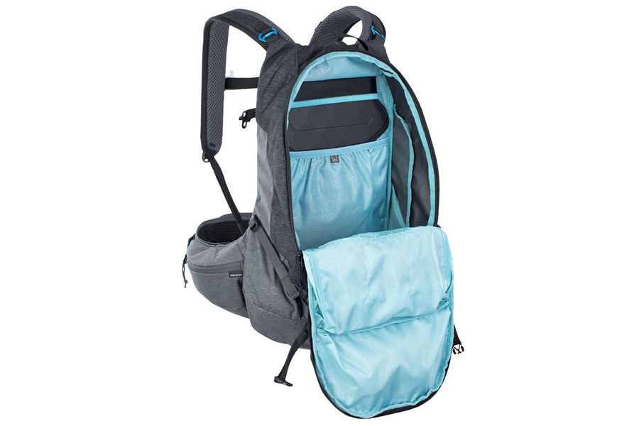 The main features of EVOC's "Body Hugging" fit are positioning the pack as close to the body as possible, and distributing the weight over a large area on the hips. Thanks to the optimized connection between the shoulder straps and the wide hip fins that "grow" out of the back panel, the backpack remains reliably in position during any action and as stable as possible - for more comfort and control.