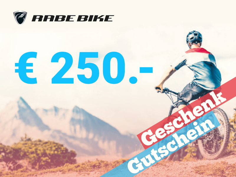 | Details | Du suchst ein passendes Geschenk oder möchtest eine "Starthilfe" für einen Bikekauf bei RABE verschenken? Kein Problem mit unserem Geschenkgutschein. Falls der Betrag Deiner Wahl nicht verfügbar ist, kannst Du ihn per Email an shop@rabe-bike.pro oder telefonisch in unseren Filialen ordern. Nach Geldeingang bekommst Du ihn kostenlos im Original per Post zugesandt. |