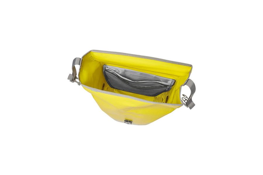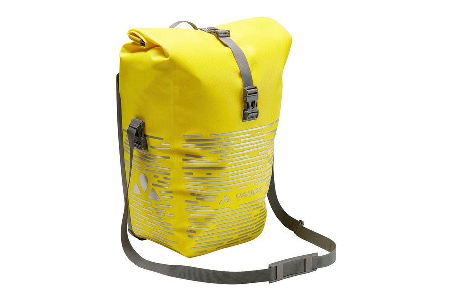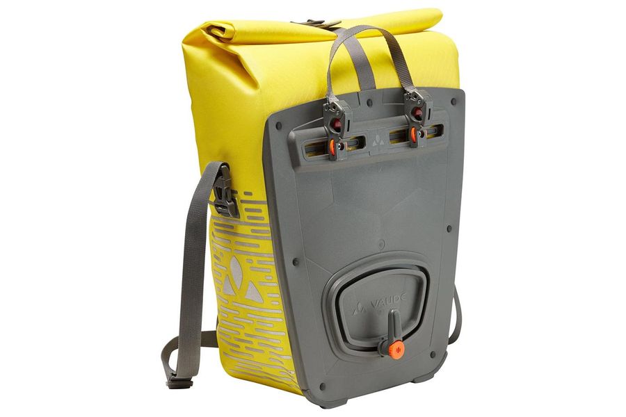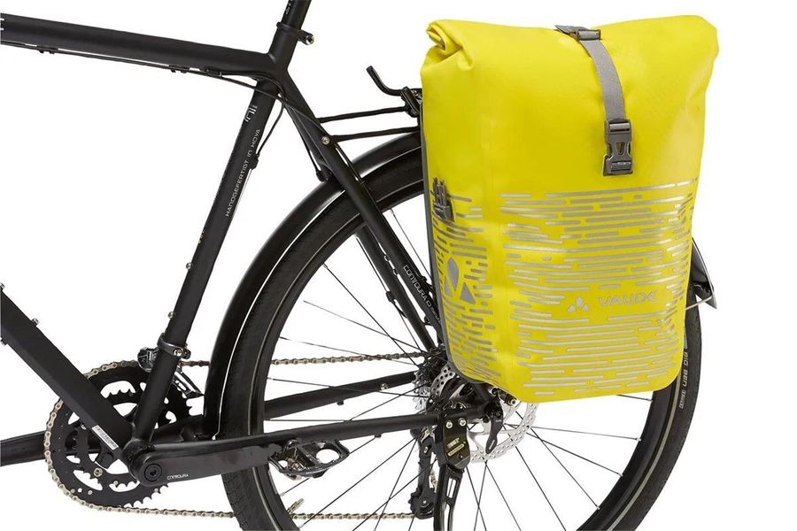 For commuters who also ride after dark! This waterproof rear pannier with large, highly reflective print is made from robust, PVC-free tarpaulin at our German VAUDE site near Lake Constance using a high-frequency welding process. It can be individually adjusted to just the size you want with its roll closure and is absolutely watertight. An inner compartment with small zip mesh pockets ensures clear organization. The bike bag is attached to the rear gear rack with the QMR 2.0 system and a sturdy back panel. Just pull the strap connecting the two hooks to conveniently open the system. The system can be secured with a small lock (such as the TSA Lock, not included). It can be easily adjusted with a dial and is completed by the fully adjustable lower rail hook. A practical shoulder strap makes it easy to carry when you're walking. For commuters who are making their way home after dark, this highly reflective bike bag is a must have for the daily journey to the office. In addition, The Aqua Back Luminum bag can be complemented with these accessories: Sortyour Business, Sortyour Back, Addita Bag.