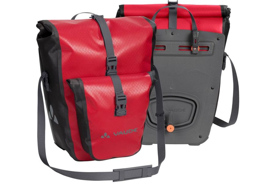 Get out and explore that world around you! The waterproof rear panniers are climate neutrally manufactured at the German VAUDE company headquarters near Lake Constance with durable, PVC-free tarpaulin material for all world travel adventures. With a roll closure that allows you to customize the size of the bag and seal it so that it's water tight. An extra inside pocket and outer welded pocket makes it easy to store things separately. The bags are securely attached to the right and left sides of the back gear rack with the QMR 2.0 system, which also allows for easy adjustment and quick on-and-off. With a bike lock, they can be directly locked onto the QMR hook. With reflective elements. Included: two bags (pair). Can be used together with the practical accessory bags: Toolbag Back, Sortyour Back, Addita Bag.