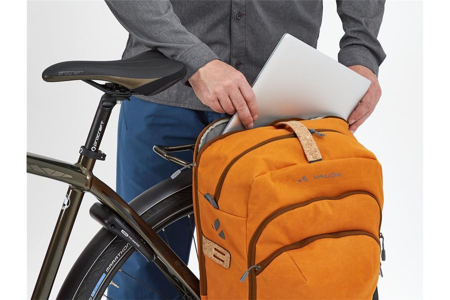 The eBack Single bike bag is a new favorite for e-bikers! It has a range of features specifically designed for e-biking and, in addition to its sturdy mounting, scores with a separate compartment for batteries, a detachable compartment for dirty clothes, a laptop compartment for devices up to 15.6" and several external zip compartments with space for everything you need on the road or at work such as documents, notebooks and folders. With the lockable QMR 2.0 mounting system, the eBack Single can be firmly and securely attached to your gear rack. The VAUDE Green Shape label stands for environmentally-friendly, functional products made from sustainable materials.